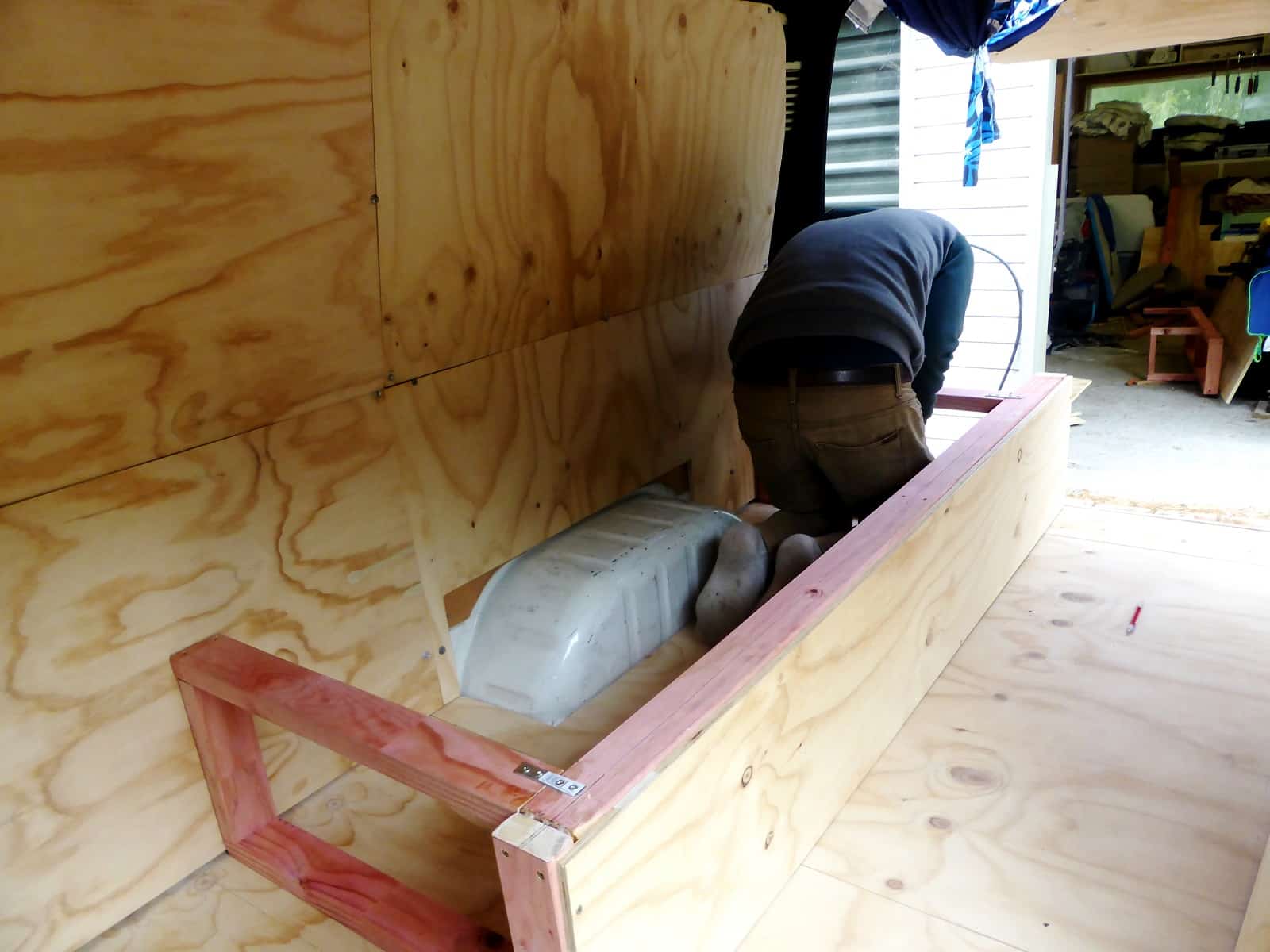Une fois l’isolation faite nous avons fabriqué deux coffrages au niveau de chaque roue arrière. Cela servira à la fois de rangement et d’appuis sur lesquels se tiendra le lit modulable en canapé.