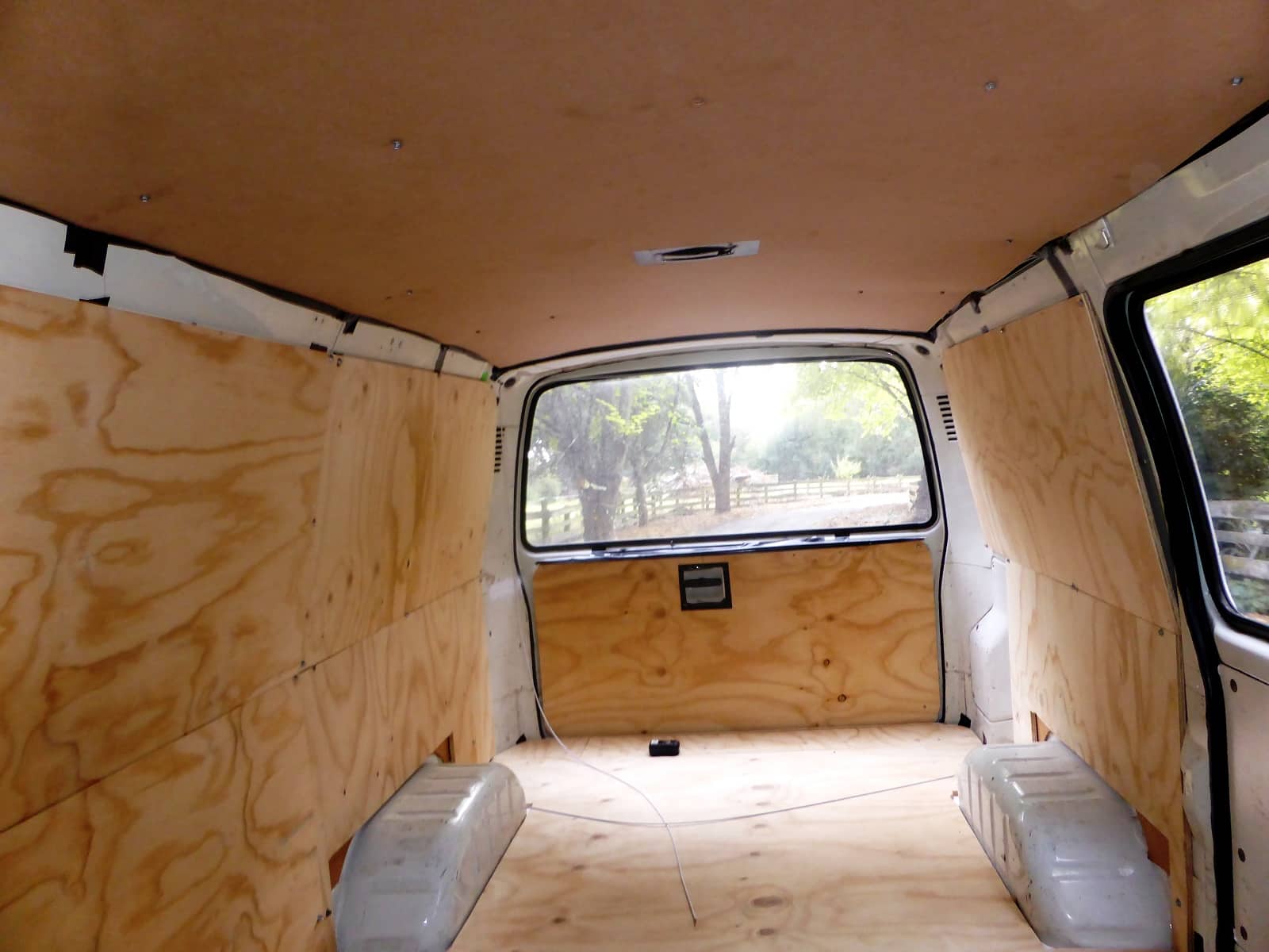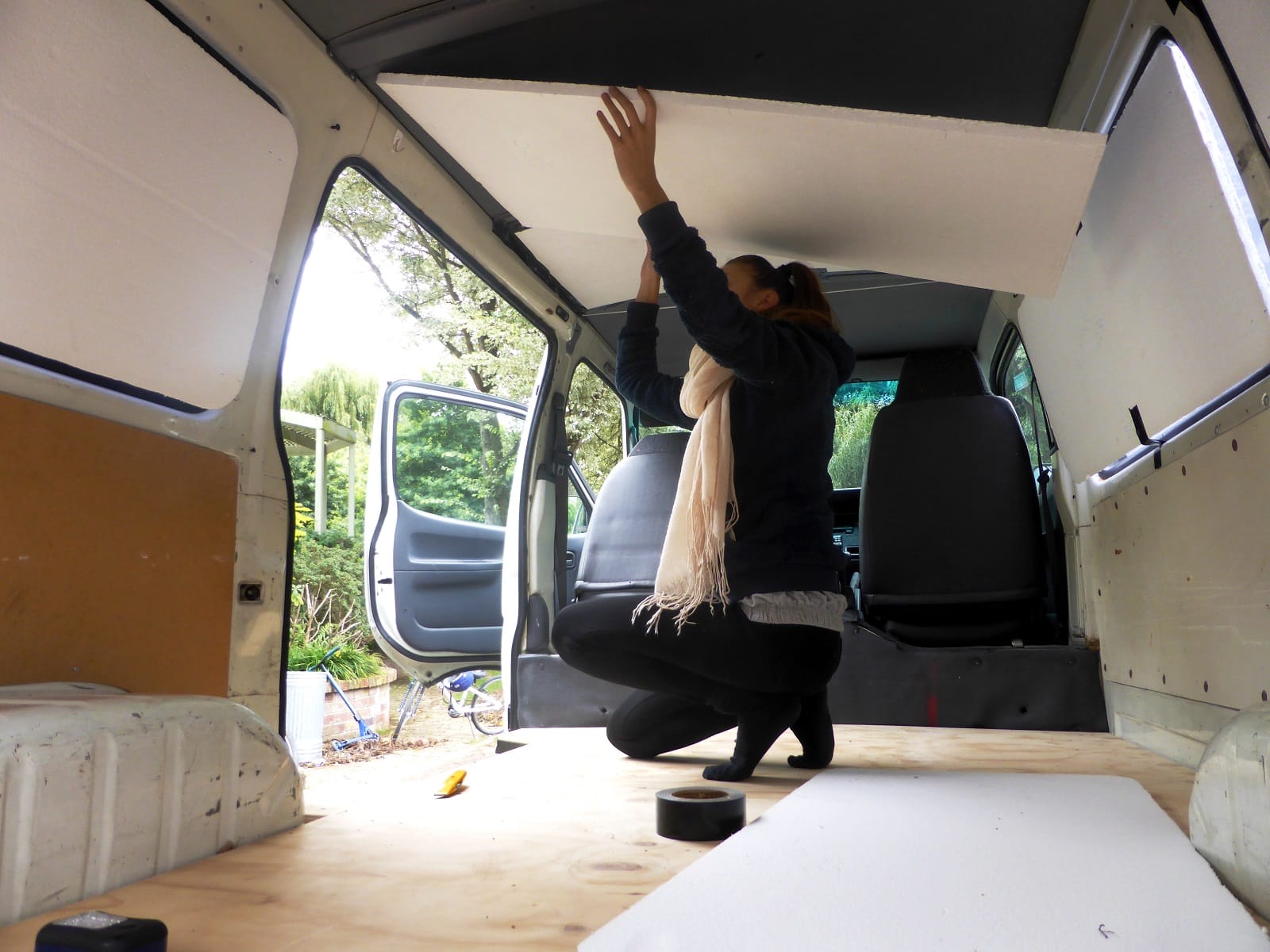 Ensuite, nous avons procédé à l’isolation du plafond toujours avec du polystyrène en fixant dessus une planche de 3 mm. Derière, pour le coffre, nous avons procédé de la même façon mais avec une plaque de polystyrène amovible afin de garder la fenêtre arrière pour conduire.