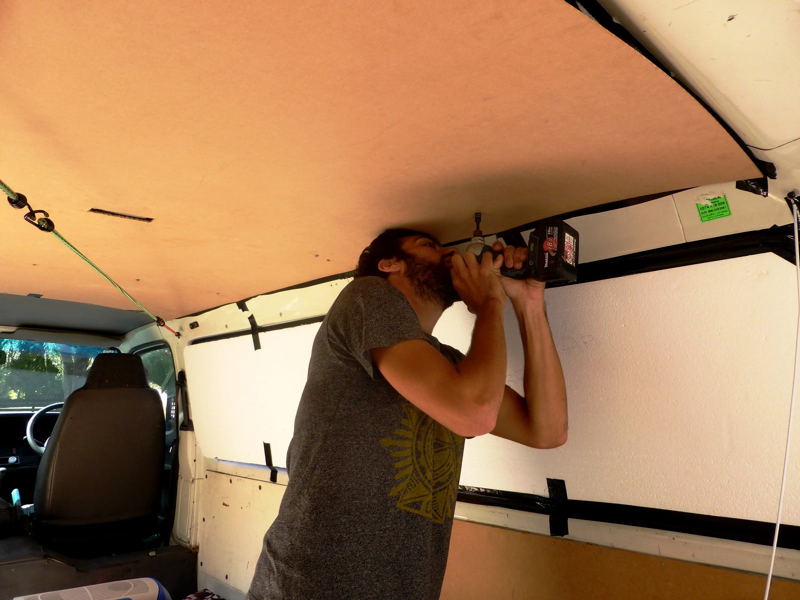 Enfin, nous avons recouvert le tout avec des planches de bois de 12 mm que nous avons directement fixées aux parois du van. Nous avons comblé les vides avec la pose d’une moquette.