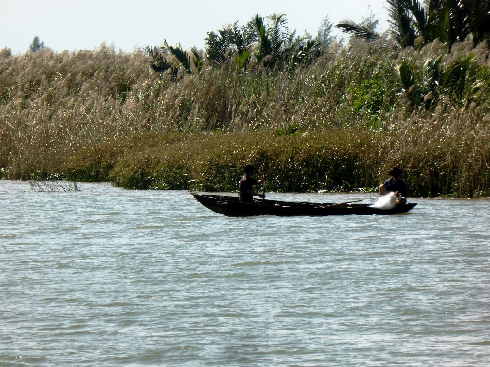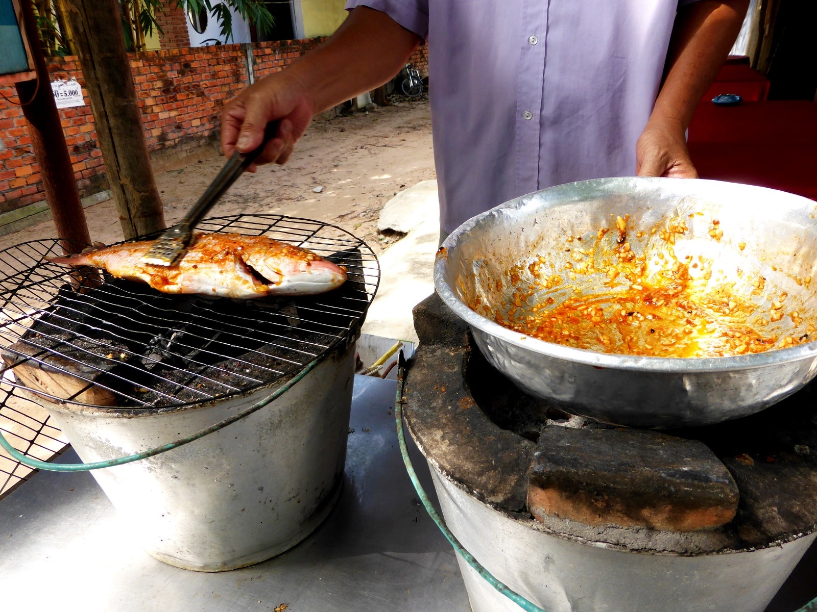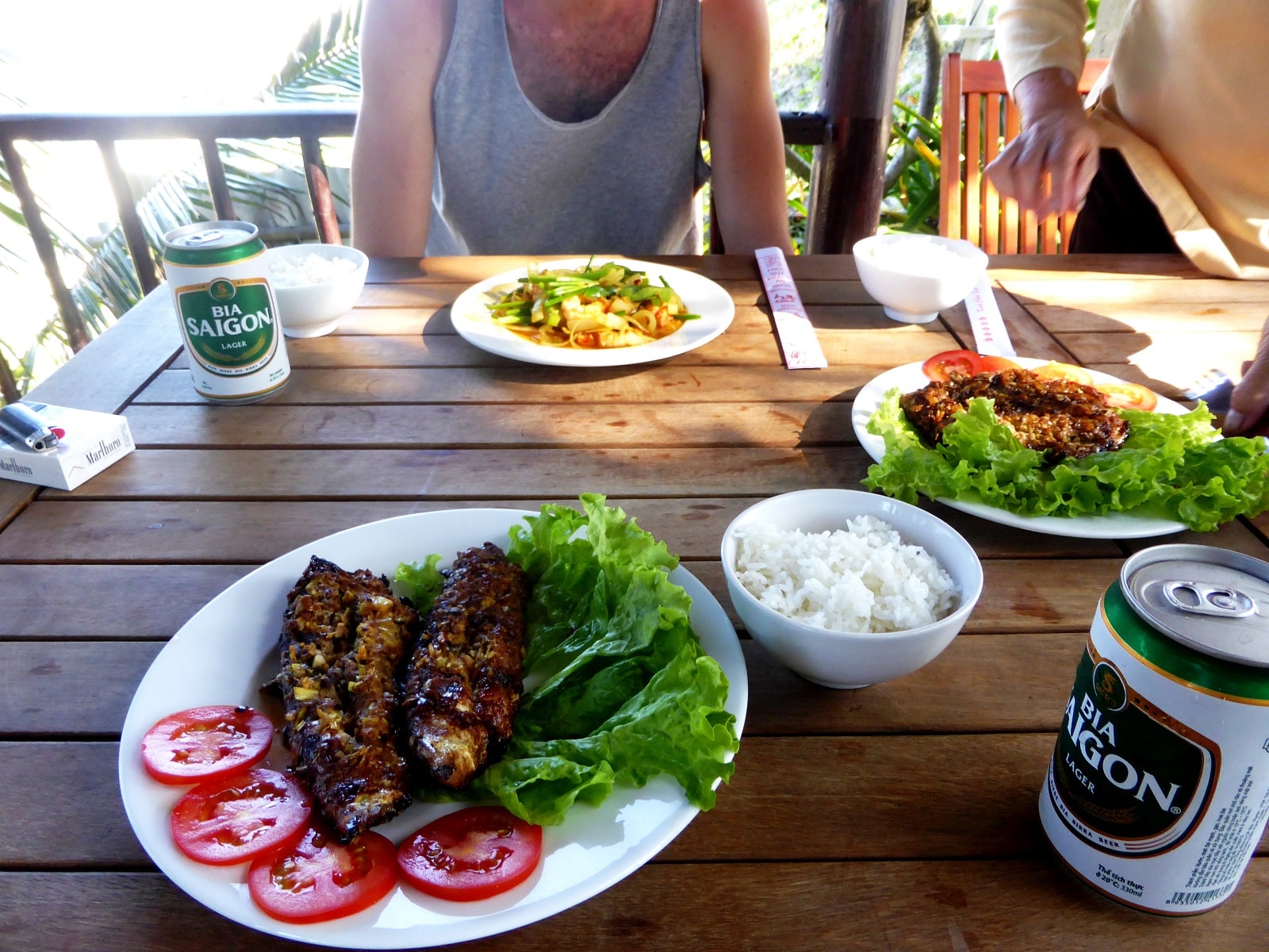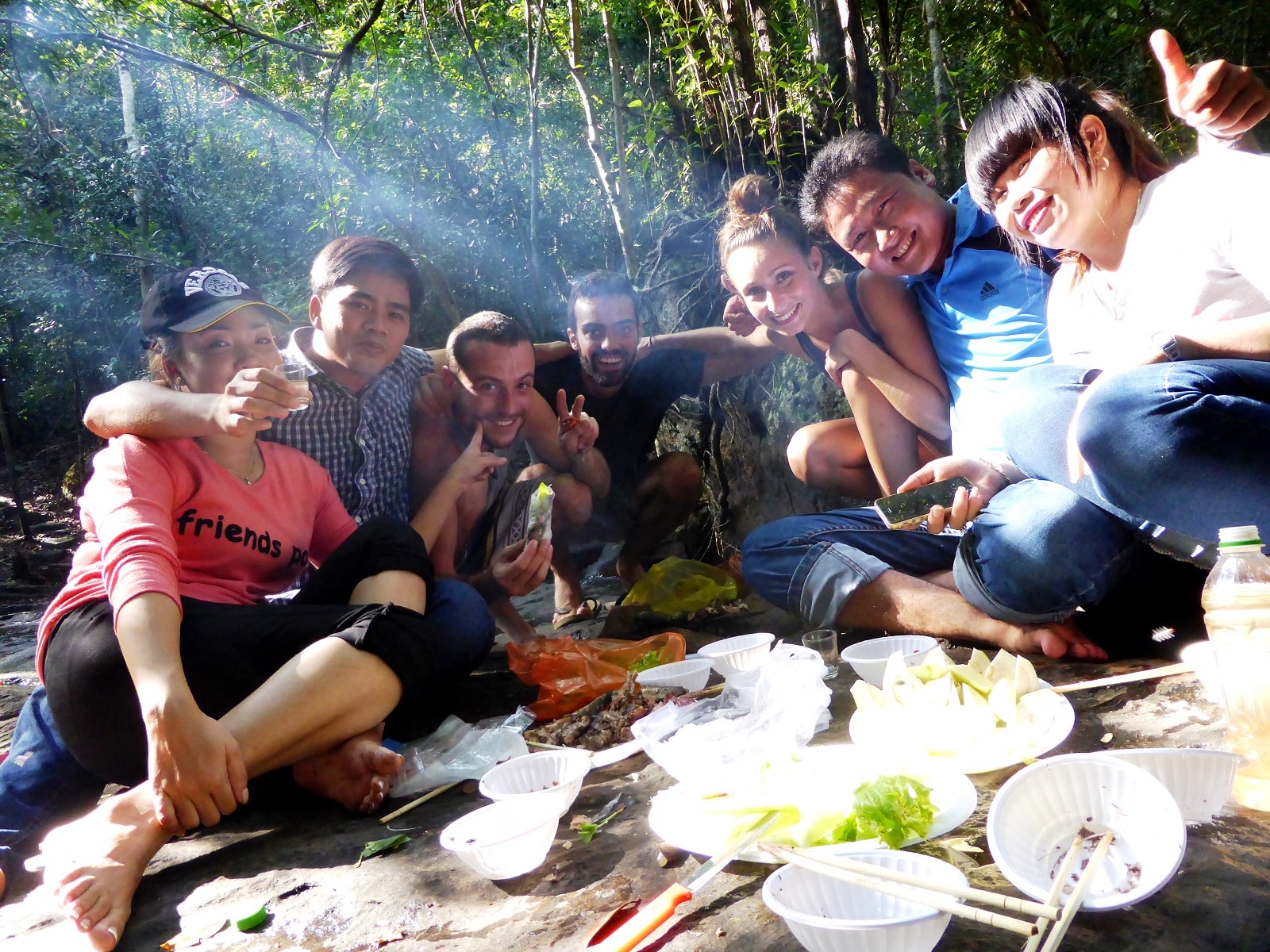 Cependant, des locaux venus faire un barbecue au bord de l’eau nous invitent à les rejoindre. Très chaleureux, ils nous offrent de l’alcool de riz et des spring-rolls de poisson (qu’ils font cuire sur place).
