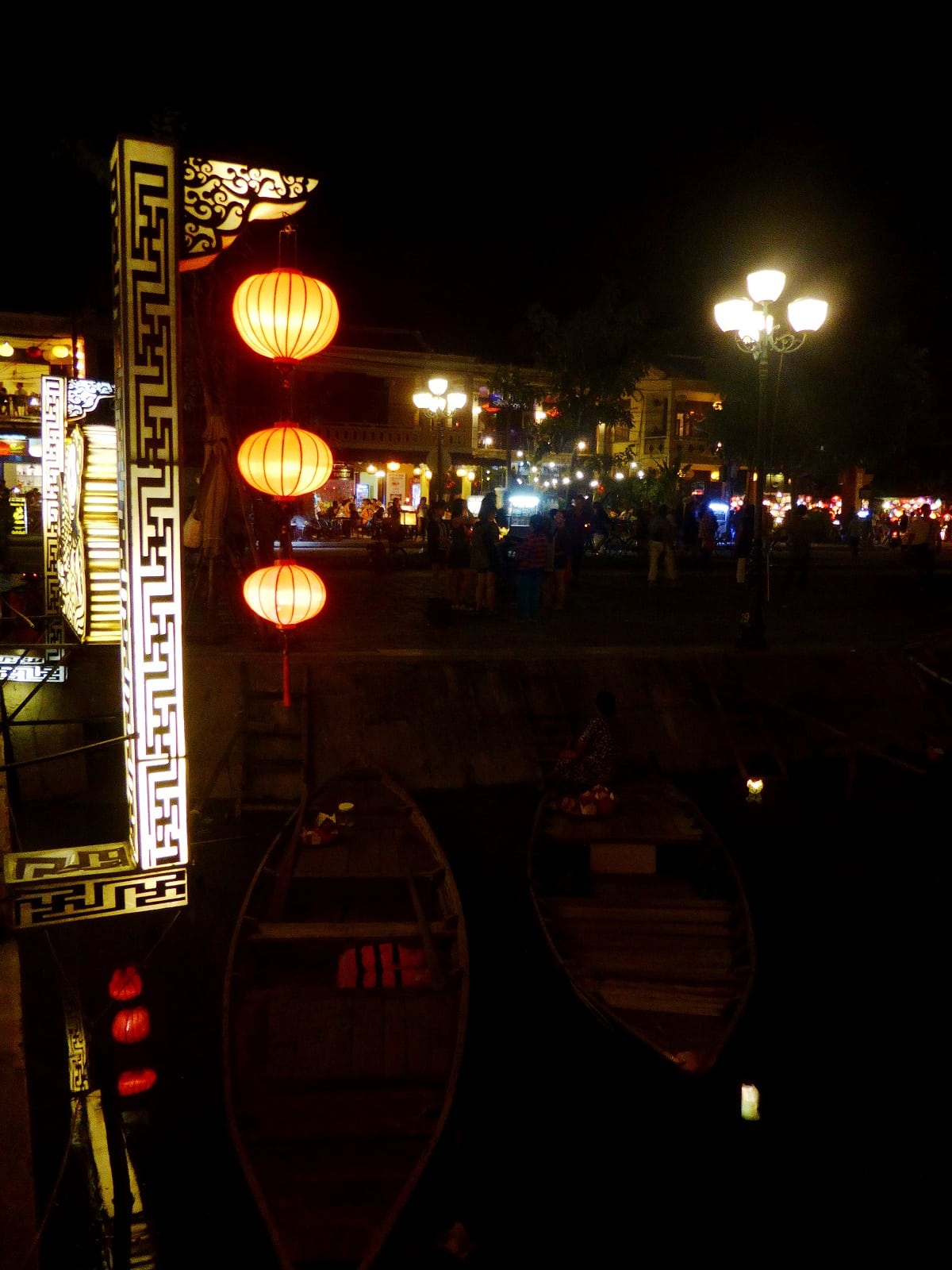 La nuit tombé, c’est magnifique! Les petits stands sortent, vous trouverez plein de jolis souvenirs à ramener ou des bonnes choses à déguster! Les lumières des lanternes et des restaurants se reflètent sur l’eau de la rivière…Très beau moment à passer en amoureux!