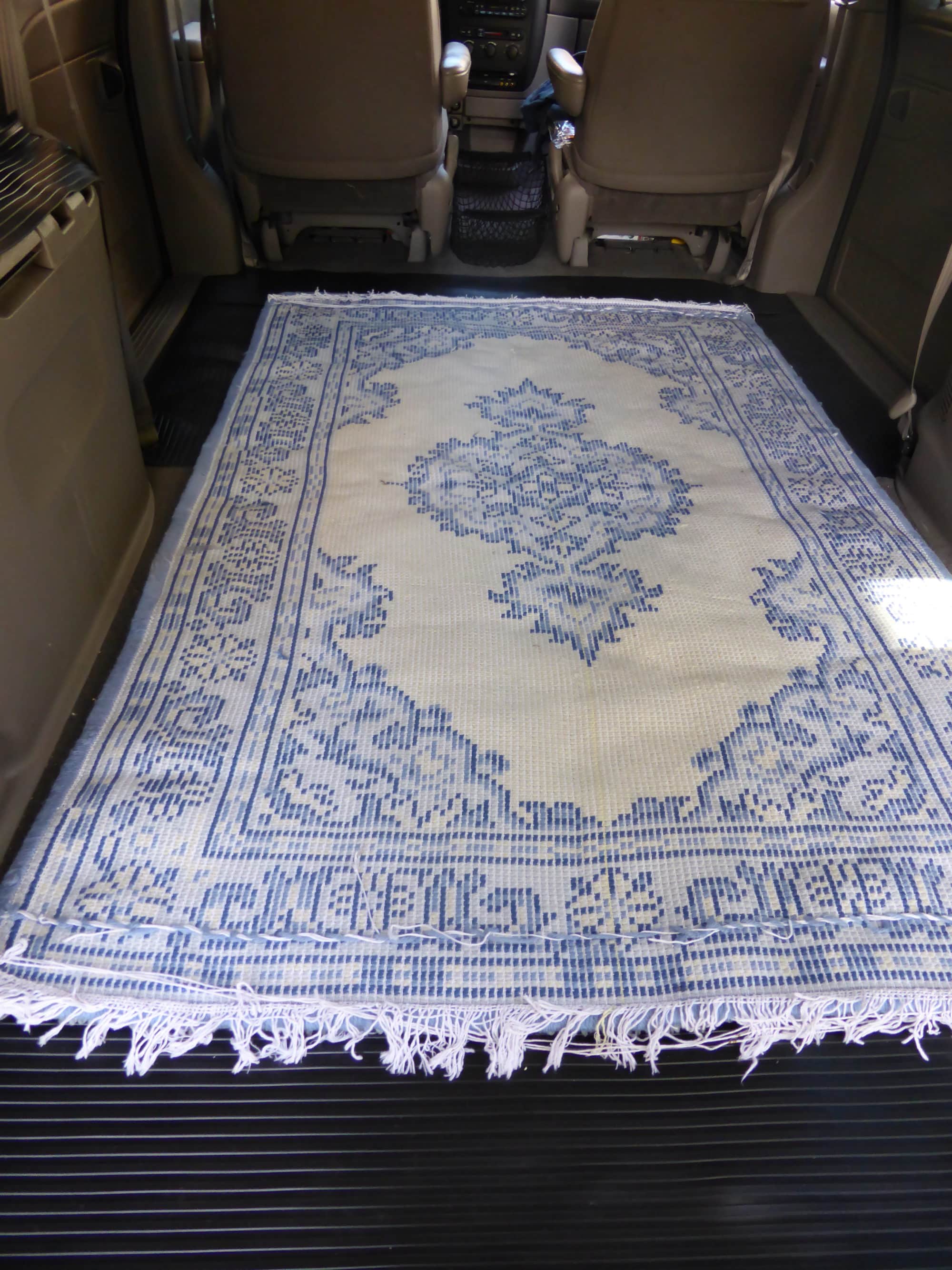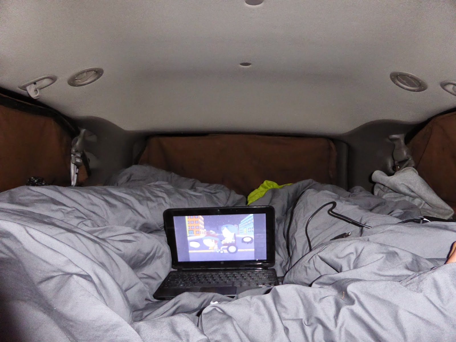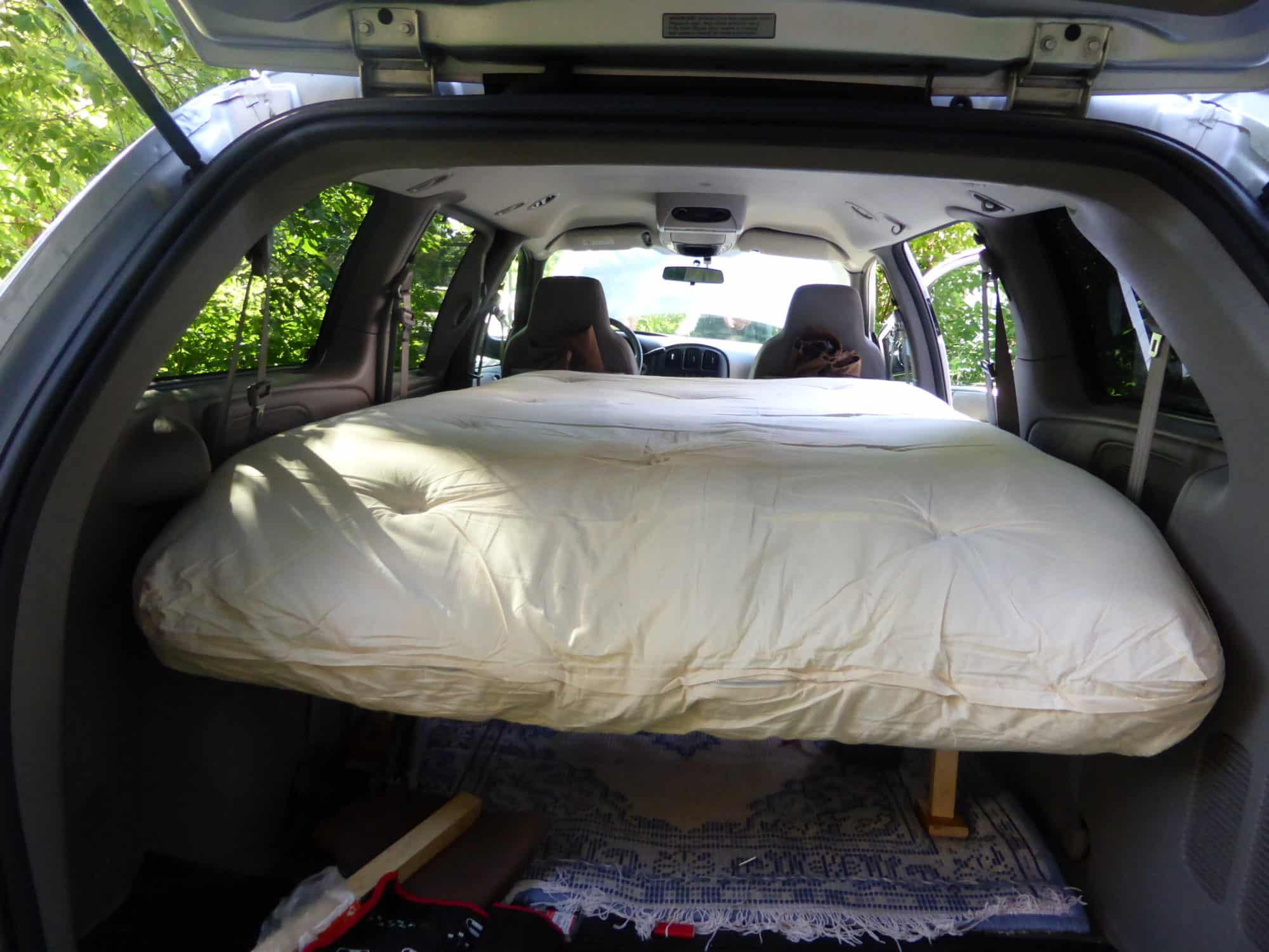Etant équipé de 6 sièges, c’était purement un véhicule familial. Nous l’avons nous-même aménagé pour en faire notre maison. Là encore la chance a été de notre côté car le 1er juillet est la date de déménagement au Québec. Ainsi durant les semaines qui précèdent et qui suivent, nombre de meubles ou autre fournitures sont déposés devant les maisons et laissés à la disposition de qui veut… Aubaine pour nous pvtiste avec un petit budget, nous avons pu récupérer un meuble Tv qui nous a servi d’appui pour notre sommier mais aussi un tapis pour protéger le sol.