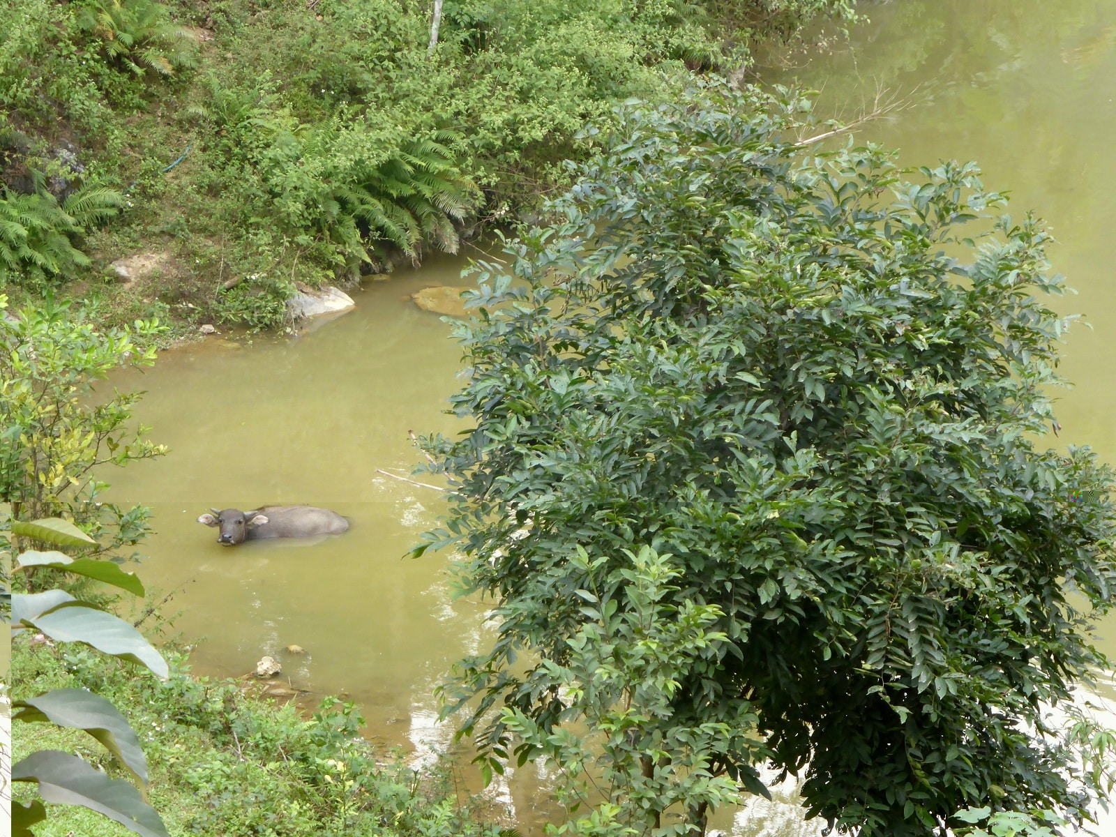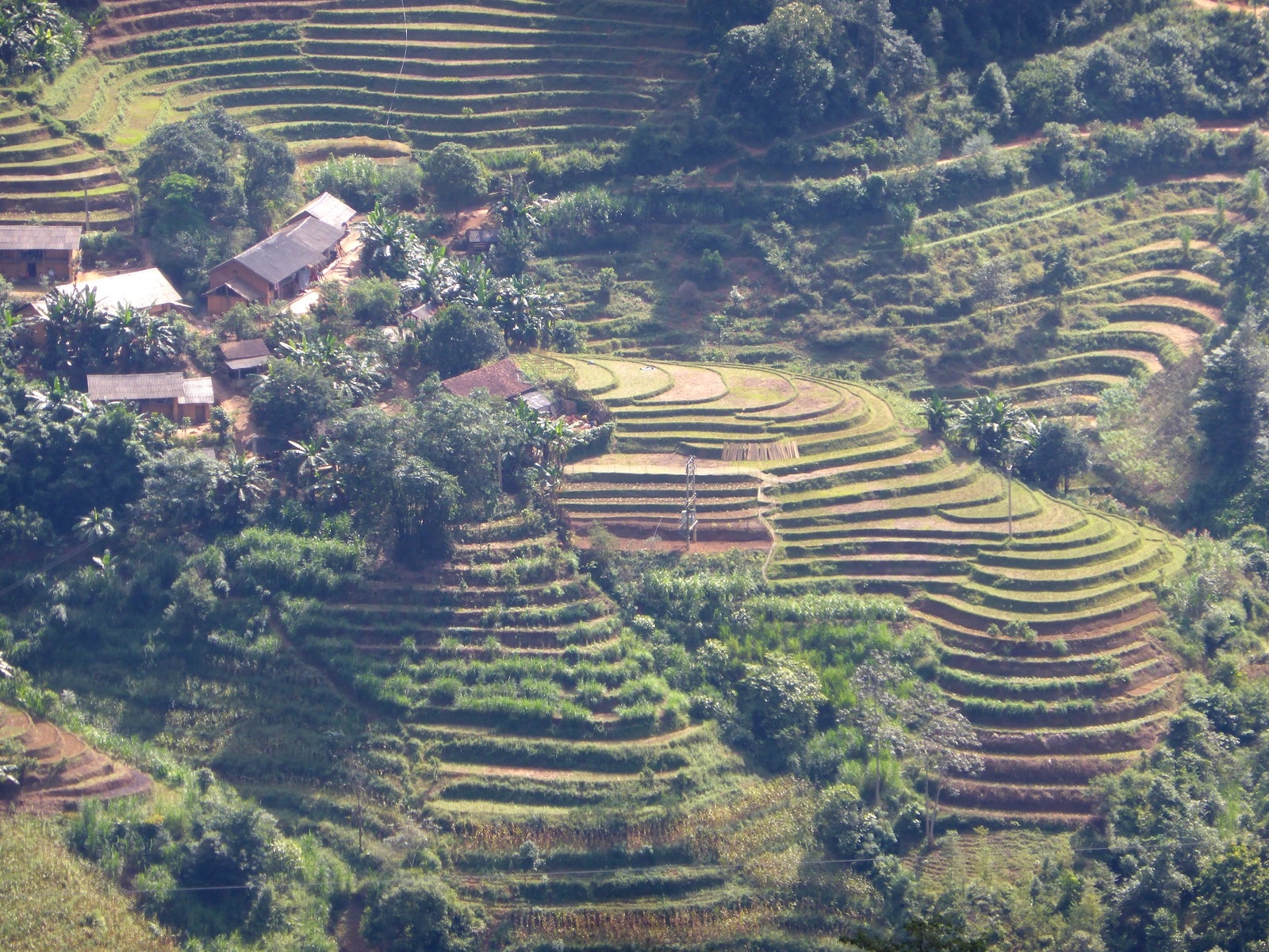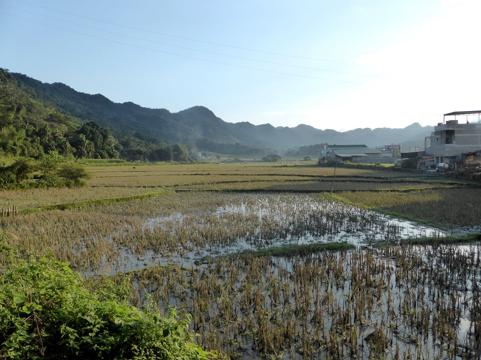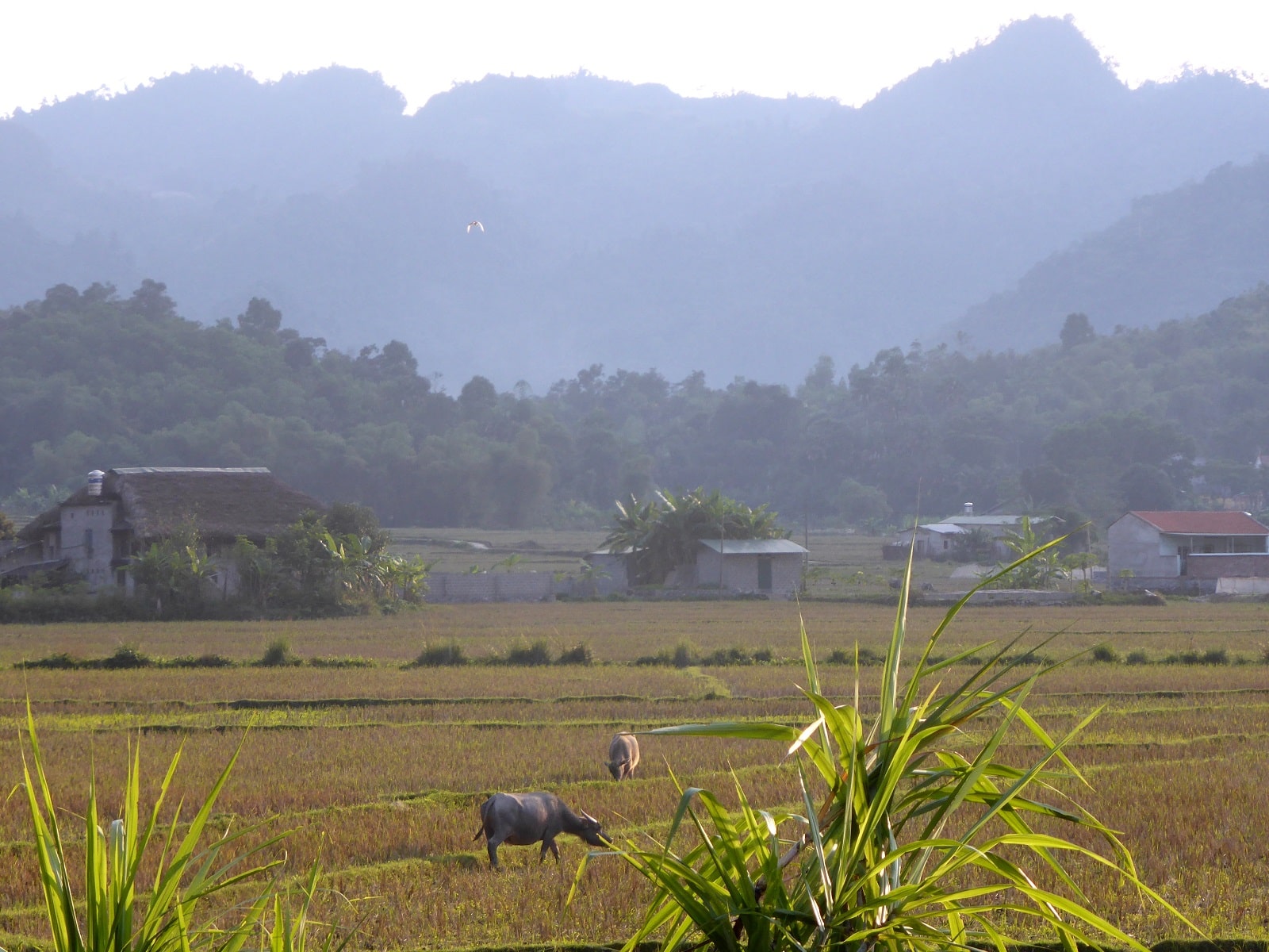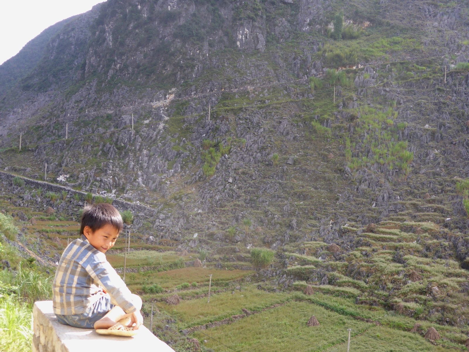 Les rizières en étages s’étendent à perte de vue, à chaque virage la route découvre des panoramas époustouflants. Le charme opère, on est conquis par tant de beauté. On aperçoit de nombreux villageois habillés de colorés costumes traditionnels certains travaillant aux champs (notamment de très jeunes enfants). D’autres font la route à pied vers le marché hebdomadaire de Dong van. Etonnant comme leur vie parait si éloignée de la nôtre, rythmée par la culture du riz, aidés de leurs buffles d’eau.