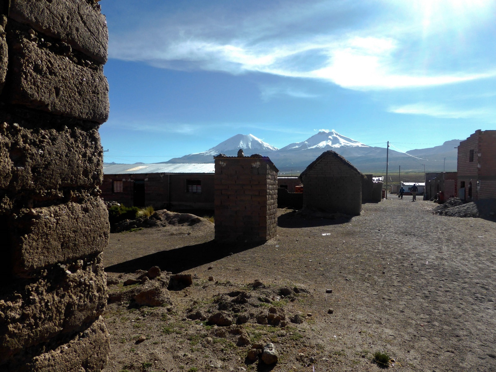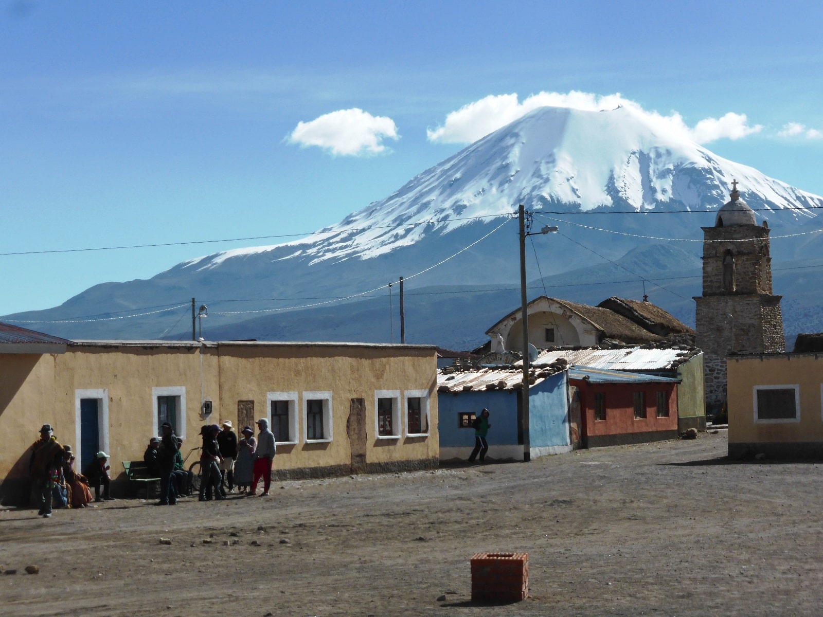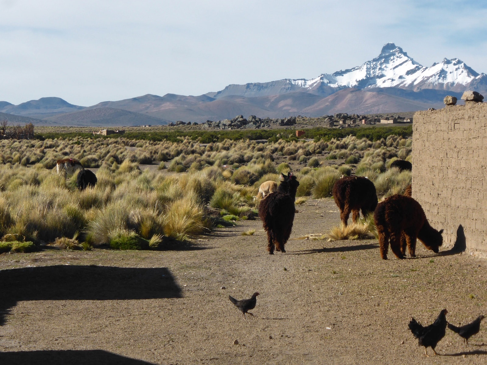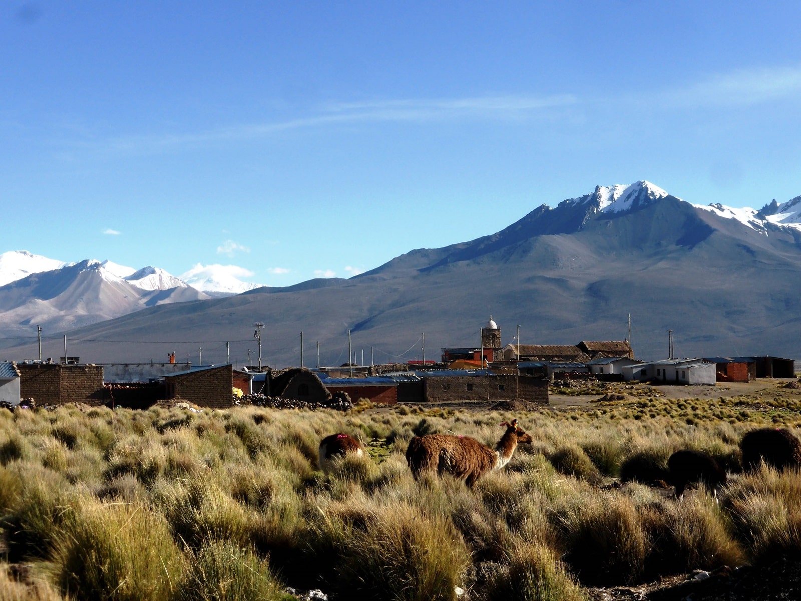 Dès notre arrivée, le spectacle est éblouissant. Déjà, on aperçoit, le majestueux volcan Sajama, celui-ci ne nous quittera pas jusqu’à la fin. Peut importe où vous serez, vous pourrez l’admirer! Et puis, il y a ce village, au milieu de rien à 4300 mètres d’altitude, c’est désert et silencieux. L’impression d’être arrivés au bout du monde !